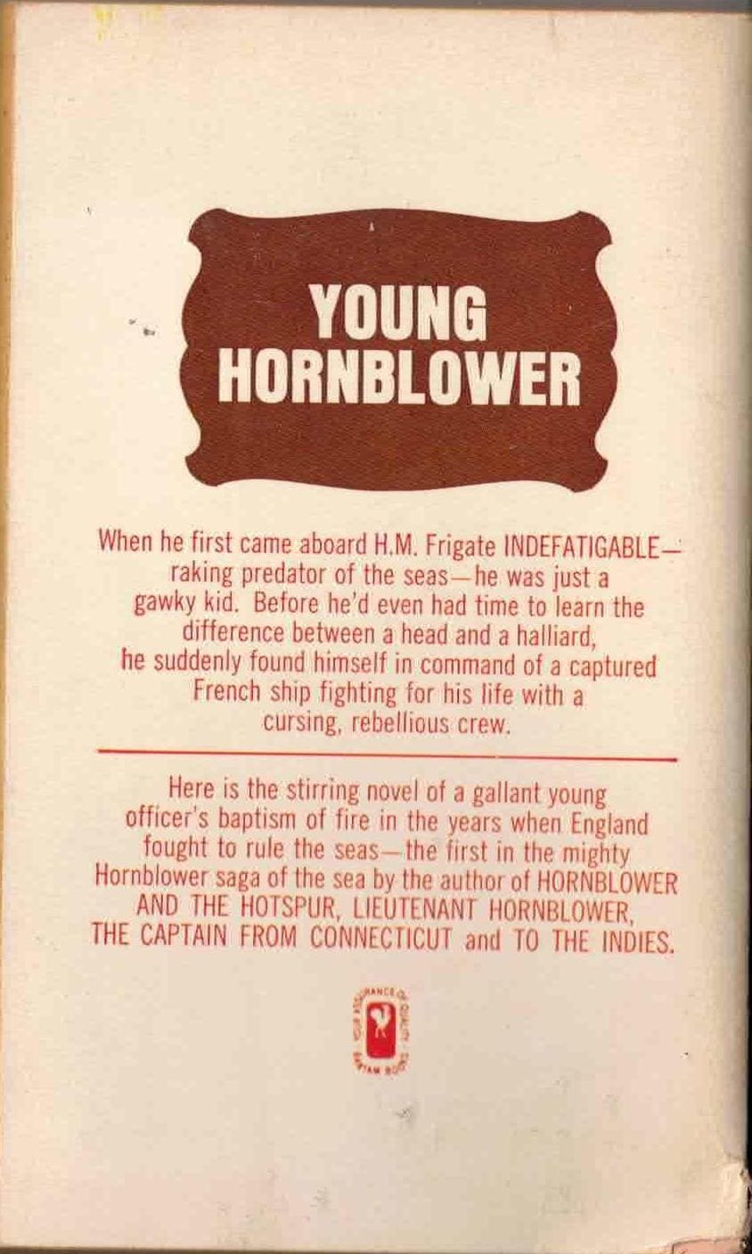 Bantam (1963). 5th printing. Cover artist not credited. Mass market paperback. First book in the Horatio Hornblower series of naval novels.